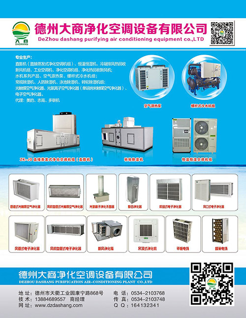 德州大商凈化空調設備有限公司是一家生產中央空調凈化空調設備及空氣凈化器的專業制造商。公司產品包括風冷屋頂式凈化空調機組、恒溫恒濕(凈化)空調機組 、單元式空氣調節機組 、冷凍除濕機組 、泳池除濕機組、風冷管道式空調機組、風冷直膨式凈化空調機組、工業除濕機組、風(水)冷柜機、 組合式空調機組、冷凝熱回收機組等一系列空調產品及中央空調末端配套使用的空氣凈化器,并可根據用戶需求設計制造各類非標產品。產品型號齊全,性能穩定可靠,外形美觀大方,使用方便舒適。