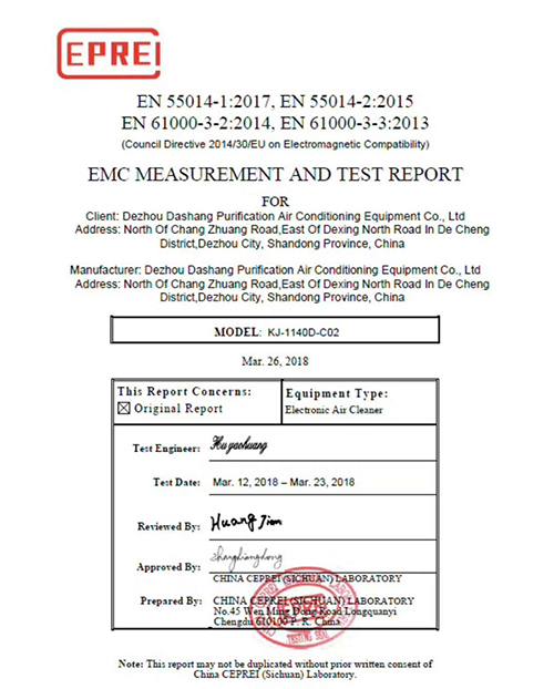 熱烈慶祝德州大商凈化空調設備有限公司研發生產的中央空調電子空氣凈化器系列產品榮獲中國電子產品可靠性與環境試驗研究所頒發的EMC電磁兼容認證證書,這是檢測部門對大商中央空調電子空氣凈化器系列產品在產品性能和產品質量的又一專業認可。更加的鼓舞了大商全體同仁不斷的開發新產品,更好的服務于廣大用戶。