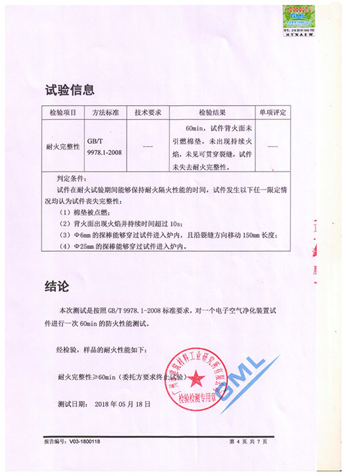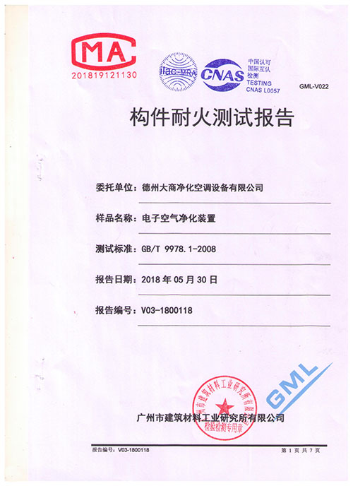 中央空調電子空氣凈化器_高壓靜電除塵_吸頂式電子空氣凈化器-恭賀我公司電子空氣凈化裝置通過權威機構構件耐火檢測